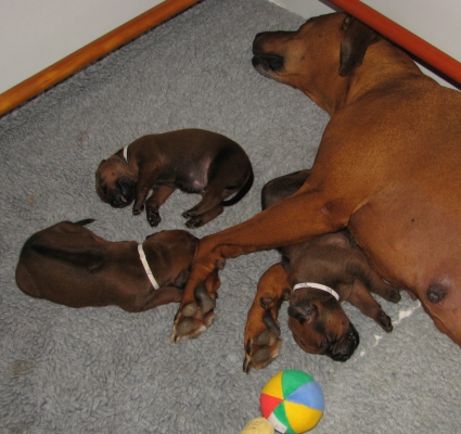 Bokima, unsere 11 Jährige Hündin, darf auch bei der Welpenpflege helfen.