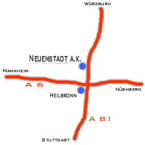 Dann ist es ganz einfach... Autobahnausfahrt Neuenstadt runter und nach Neuenstadt einfahren; Durch den Torbogen und der Straße weiter Folgen; An der ARAL-Tankstelle rechts und sofort wieder links in den Heilbronner Weg einbiegen; ca. 150 m gerade aus den Berg hoch und wiederum links in die Blumenstraße abbiegen; Wir wohnen hier in Hausnummer 4/1 |